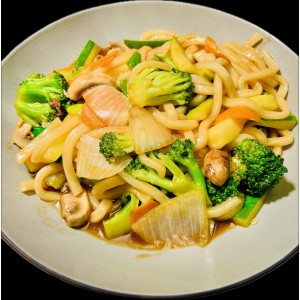 assorted fresh vegetable stir fried with japanese udon noodle..